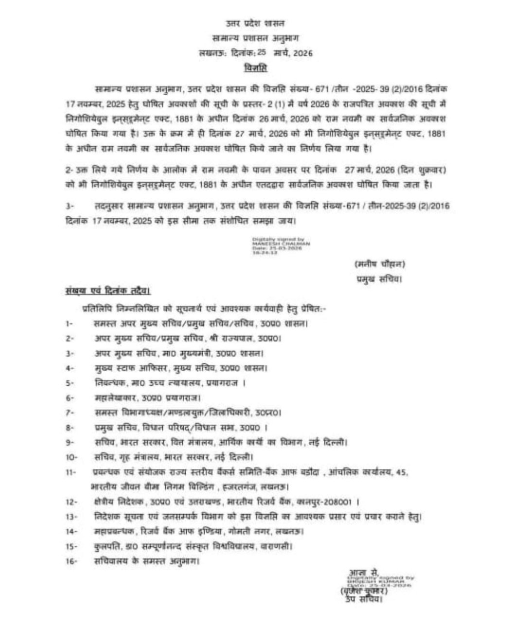सरकारी कैलेंडर में पहले से 26 मार्च को रामनवमी का अवकाश तय था, लेकिन इस बार वास्तविक नवमी तिथि 27 मार्च को आ रही है। इसी को ध्यान में रखते हुए सरकार ने बुधवार को आदेश जारी कर 27 मार्च को भी अवकाश घोषित कर दिया। बता दें कि ऐसे मामलों में कई बार तिथि और तय छुट्टी में अंतर हो जाता है, जिससे लोगों को परेशानी होती है। इस बार सरकार ने पहले ही स्थिति साफ कर दी ताकि कर्मचारियों और आम लोगों को भ्रम न रहे और सभी अपने कार्यक्रम सही तरीके से बना सकें।
